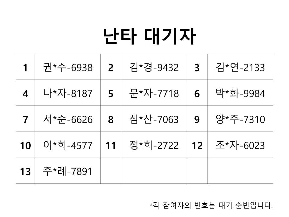 - 난타 : 총 28명 중 15명 추첨, 13명 대기