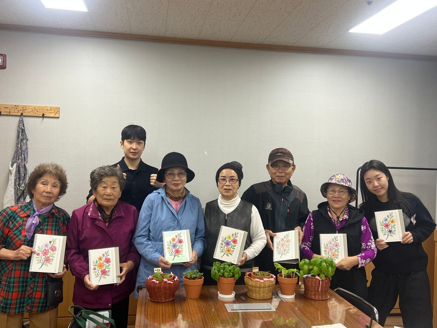 인하대학교 케어on 2명의 봉사자와 8명의 어르신이 라탄공예를 활용해 각자의 개성이 담긴 화분을 만들고